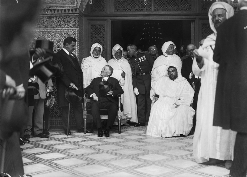 Découvrez Inauguration de la Grande Mosquée de Paris (1926) analysée par Guillaume BOUREL au travers d’œuvres et d’images d’archive. Le Maroc au cœur de la politique musulmane françaiseHenri Manuel saisit les préparatifs de la pose des personnalités politiques pour les objectifs de la presse, dans une mise en scène très protocolaire. Sont assis au centre le Président de la République Gaston Doumergue et le roi du Maroc Moulay Youssef, les deux chefs d’État semblant ainsi placés sur un pied d’égalité. Ils sont séparés par le chef de la maison militaire de l’Elysée légèrement en arrière. A gauche de l’image, le Président discute avec Édouard Herriot, président de l’Assemblée nationale, troisième personnage de l’État mais qui est également présent en