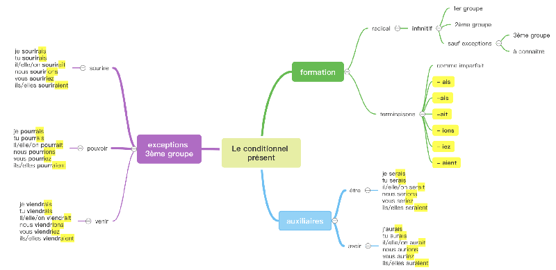 Dans conditionnel, on entend condition. Cela signifie que le conditionnel est un mode différent de l'indicatif. L'indicatif concerne une action certaine (ou considérée comme certaine) tandis que le conditionnel exprime une action soumise à une condition incertaine, à une hypothèse. Voici une une carte mentale qui présente comment conjuguer les verbes au conditionnel présent.