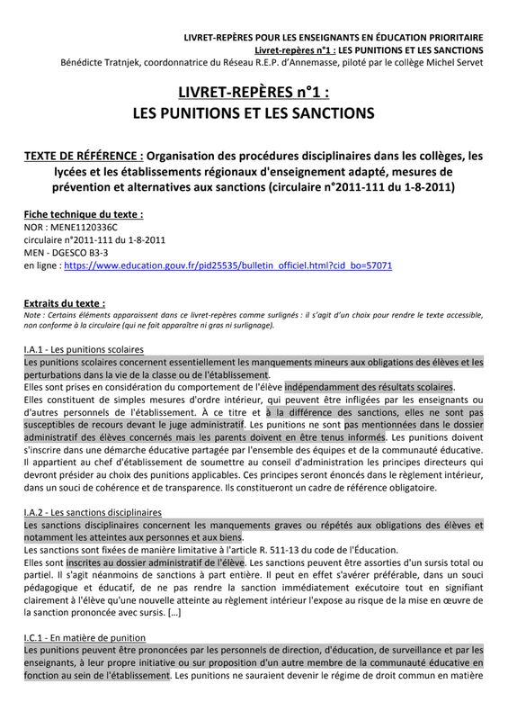 Livret-repères n°1: Les punitions et les sanctions