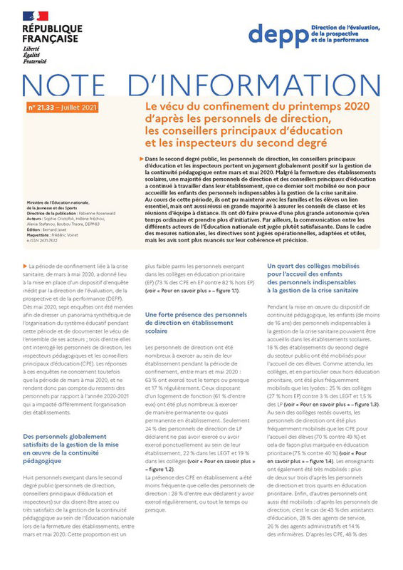 Le vécu du confinement du printemps 2020 d’après les personnels de direction, les conseillers principaux d’éducation et les inspecteurs du second (...)