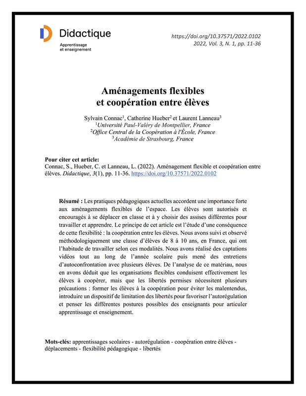 Les pratiques pédagogiques actuelles accordent une importance forte aux aménagements flexibles de l’espace. Les élèves sont autorisés et encouragés à se déplacer en classe et à y choisir des assises différentes pour travailler et apprendre. Le principe de cet article est l’étude d’une conséquence de cette flexibilité : la coopération entre les élèves. Nous avons suivi et observé méthodologiquement une classe d’élèves de 8 à 10 ans, en France, qui ont l’habitude de travailler selon ces modalités. Nous avons réalisé des captations vidéos tout au long de l’année scolaire puis mené des entretiens d’autoconfrontation avec plusieurs élèves. De l’analyse de ce matériau, nous en avons déduit que les organisations flexibles conduisent effectivement les élèves à coopérer, mais que les libertés permises nécessitent plusieurs précautions : former les élèves à la coopération pour éviter les malentendus, introduire un dispositif de limitation des libertés pour favoriser l’autorégulation et penser les différentes postures possibles des enseignants pour articuler apprentissage et enseignement.